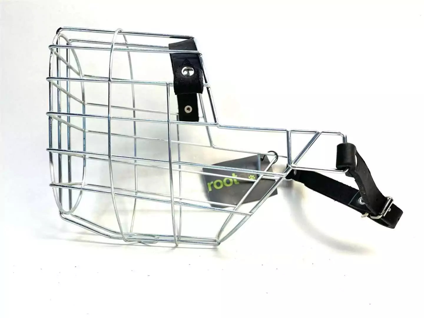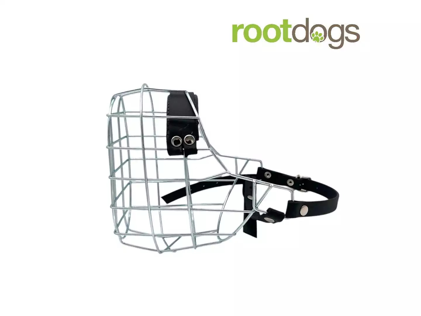 Verzinkter Drahtmaulkorb mit schwarzen Riemen und Nasenpolster aus Biothane der Serie rootdogs.